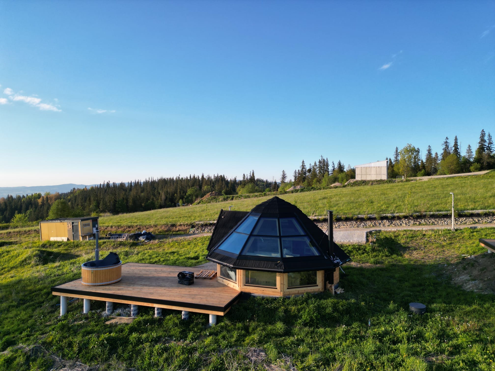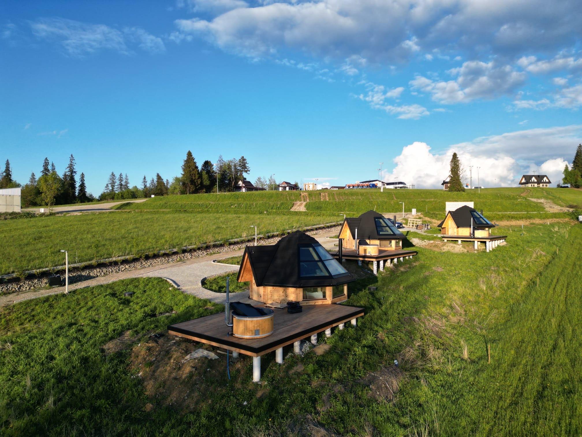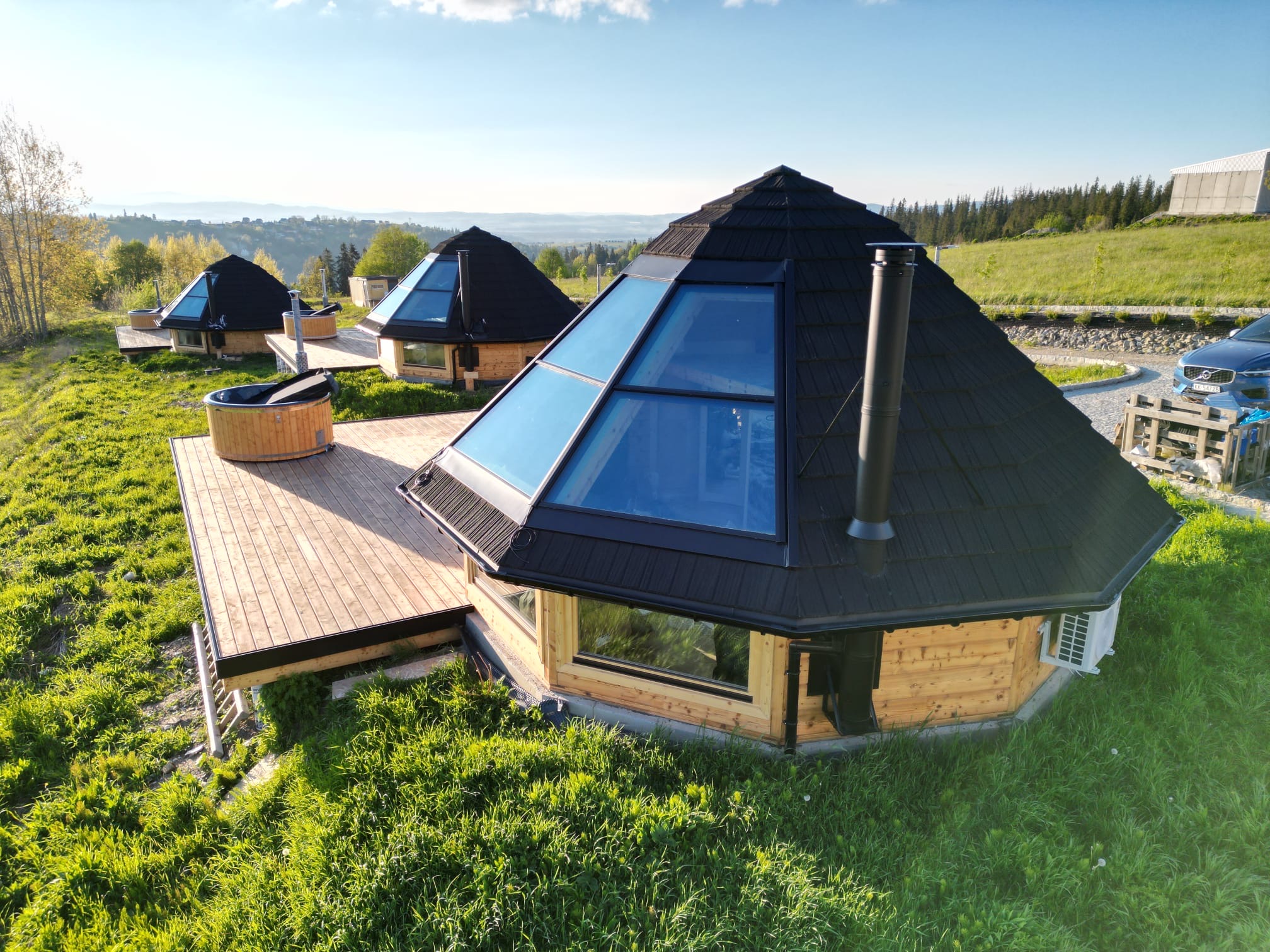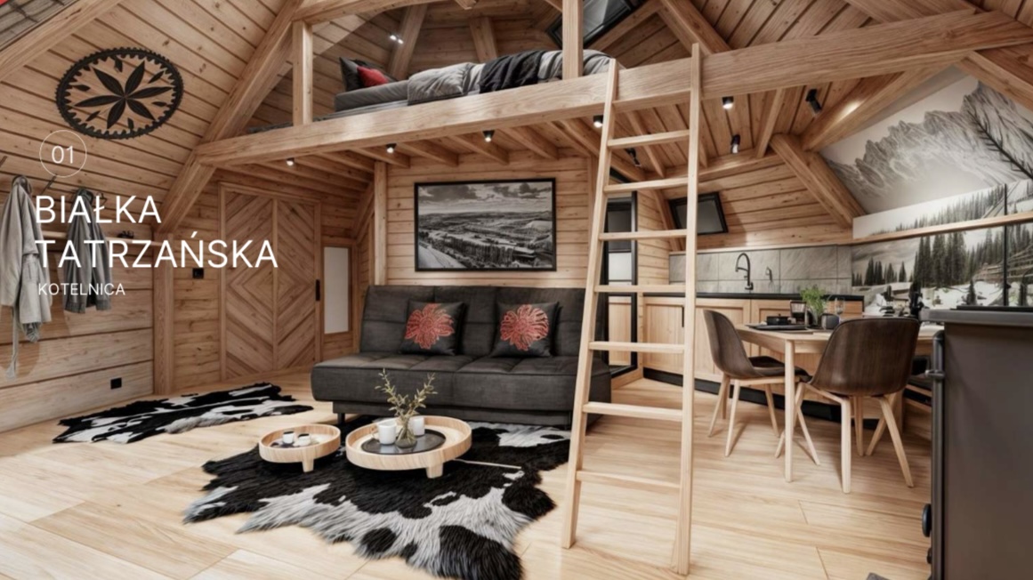 Domki w Osadzie Kotelnica zostały zaprojektowane z myślą o komforcie i harmonii z otoczeniem o pow.38 m.kw. Panoramiczne okna i przeszklony dach wypełniają wnętrza naturalnym światłem i otwierają widok na góry, a na przestronnym tarasie znajduje się prywatna całoroczna bania z funkcją jacuzzi. W domkach znajdują się również kominek, klimatyzacja oraz w pełni wyposażona kuchnia. Domek posiada łazienkę, przestronny, przeszklony taras, antresolę oraz aneks kuchenny. Dostęp do Wi-Fi umożliwia wygodne łączenie wypoczynku z pracą zdalną.
