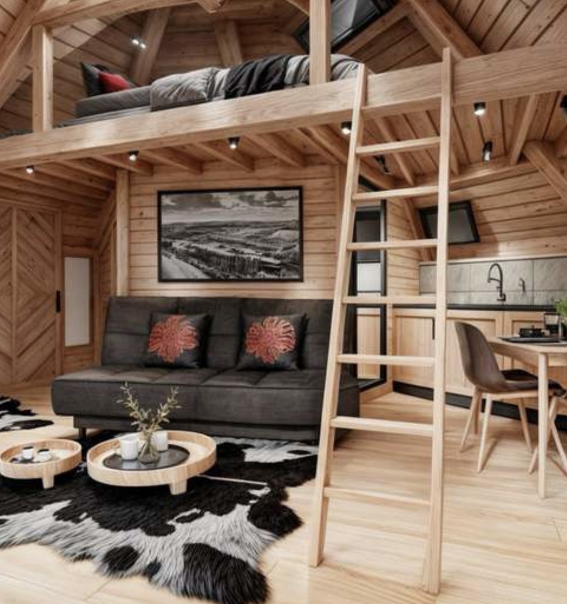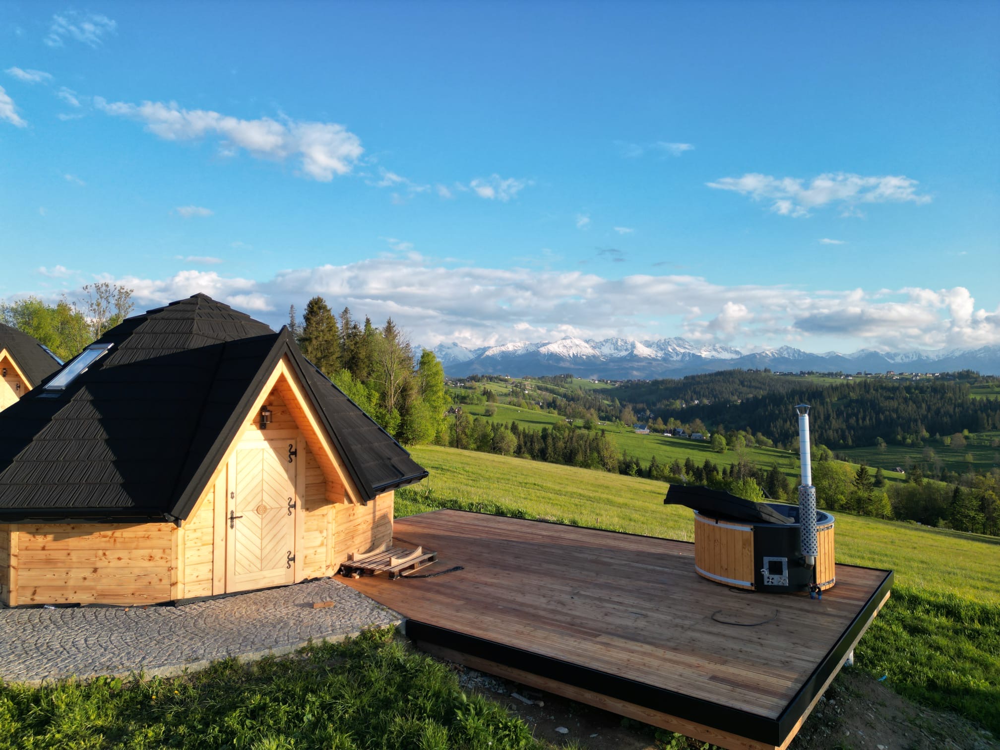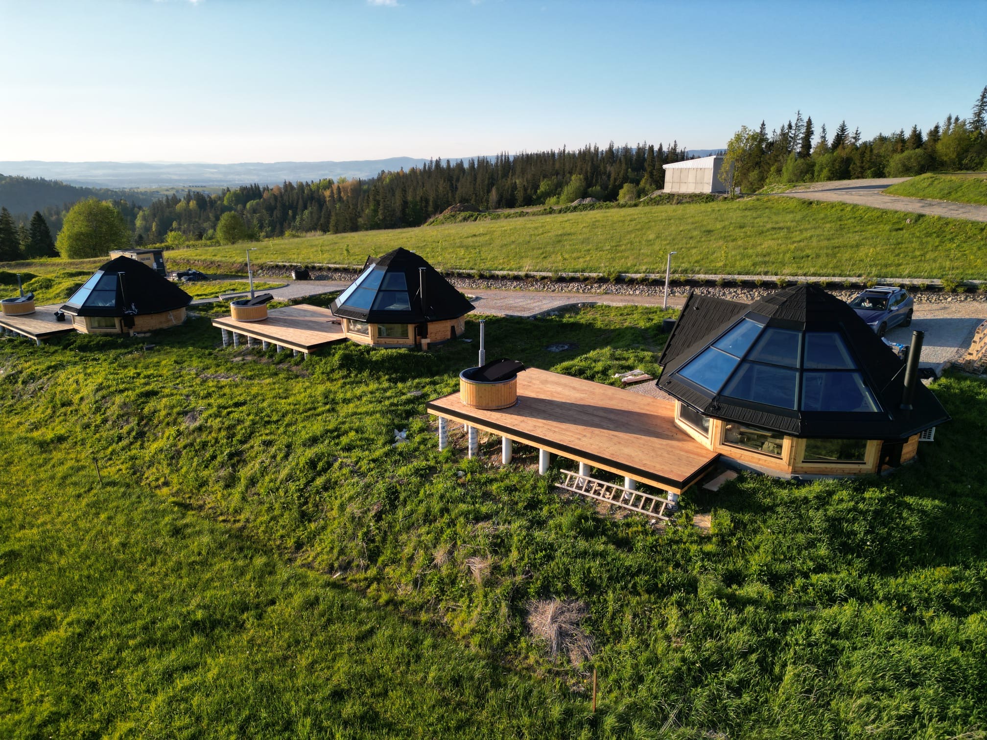 Domki w Osadzie Kotelnica zostały zaprojektowane z myślą o komforcie i harmonii z otoczeniem o pow.38 m.kw. Panoramiczne okna i przeszklony dach wypełniają wnętrza naturalnym światłem i otwierają widok na góry, a na przestronnym tarasie znajduje się prywatna całoroczna bania z funkcją jacuzzi. W domkach znajdują się również kominek, klimatyzacja oraz w pełni wyposażona kuchnia. Domek posiada łazienkę, przestronny, przeszklony taras, antresolę oraz aneks kuchenny. Dostęp do Wi-Fi umożliwia wygodne łączenie wypoczynku z pracą zdalną.